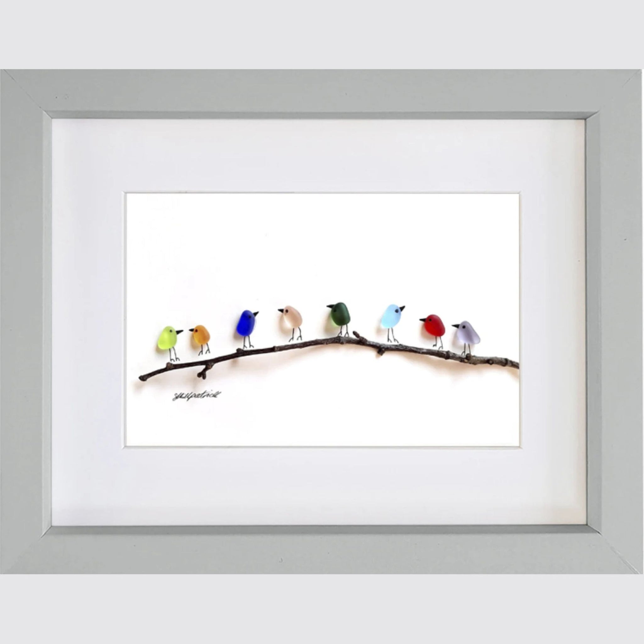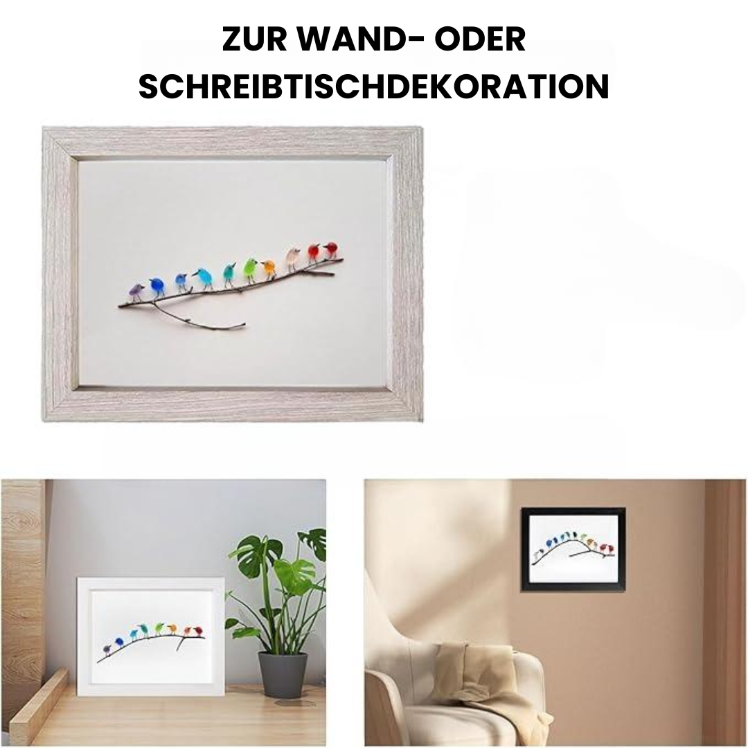🐦 Künstlerisch Die leuchtenden Farben und handbemalten Beine jedes Vogels erzeugen eine atemberaubende visuelle Harmonie, die durch echtes Seeglas und fachmännische Handwerkskunst noch verstärkt wird.