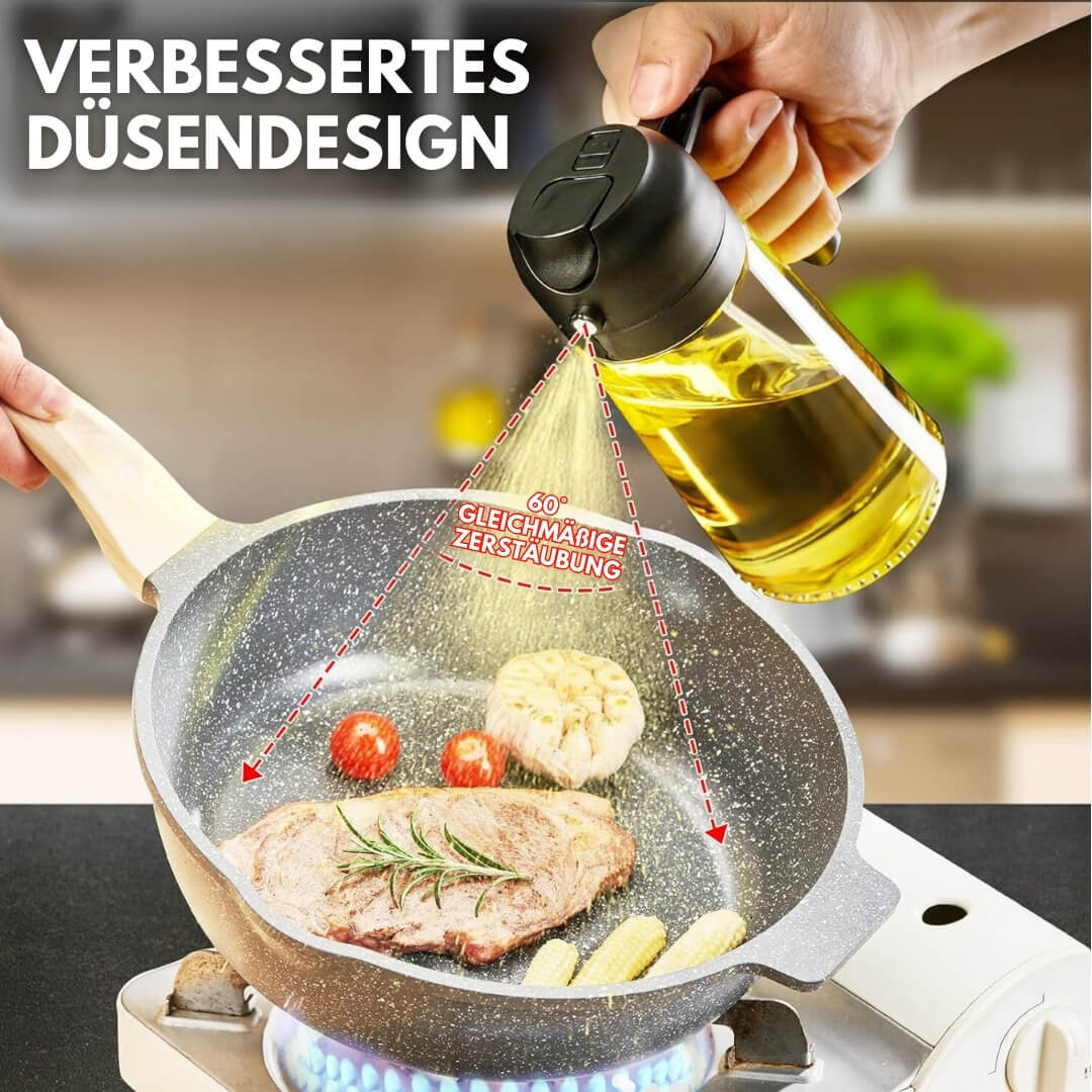 Kontrollieren Sie genau, wie viel Öl Sie verwenden. Unser Ölspender ermöglicht es Ihnen, jede Mahlzeit perfekt zu dosieren, ohne Risiko einer Überdosierung oder Verschwendung. Ideal für Salate, Pfannen und alles dazwischen.