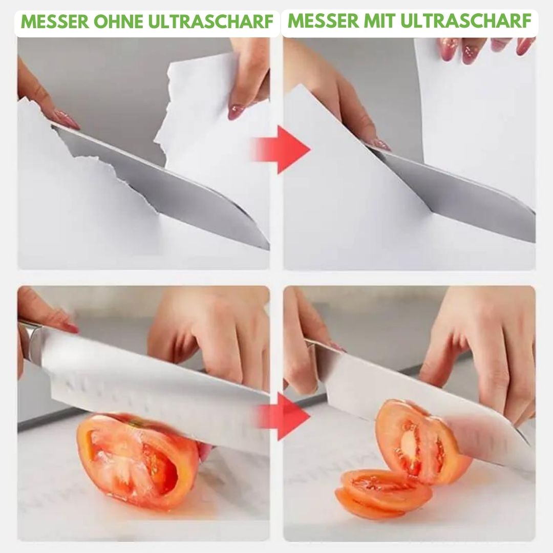 Mit Ultrascharf sind Ihre Messer immer bereit für jede kulinarische Herausforderung. Stellen Sie sich vor, Sie müssten sich nie wieder mit einem stumpfen Messer herumschlagen, um ein Essen zuzubereiten.