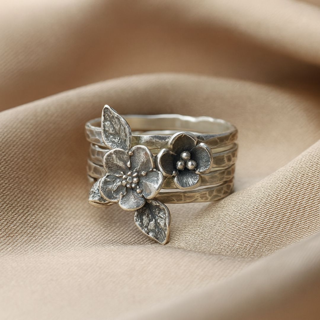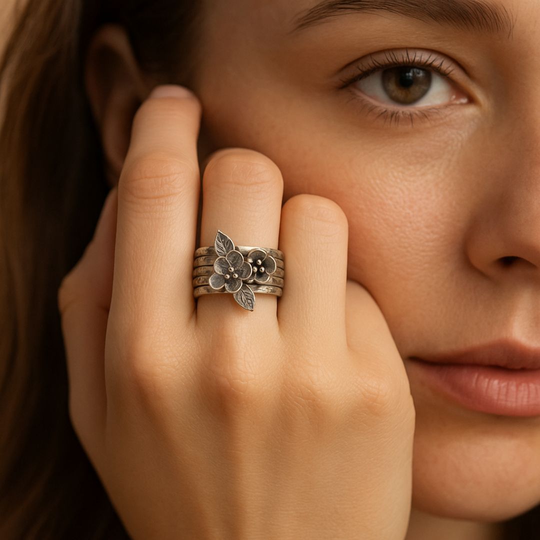 Das detailreiche Muster aus zarten Silberblüten schafft ein harmonisches Zusammenspiel von Naturinspiration und edler Raffinesse. Jede Schicht legt sich sanft übereinander und erzeugt so eine besondere Tiefe – ein Ring, der feminine Leichtigkeit mit einem Hauch von Vintage-Romantik verbindet.